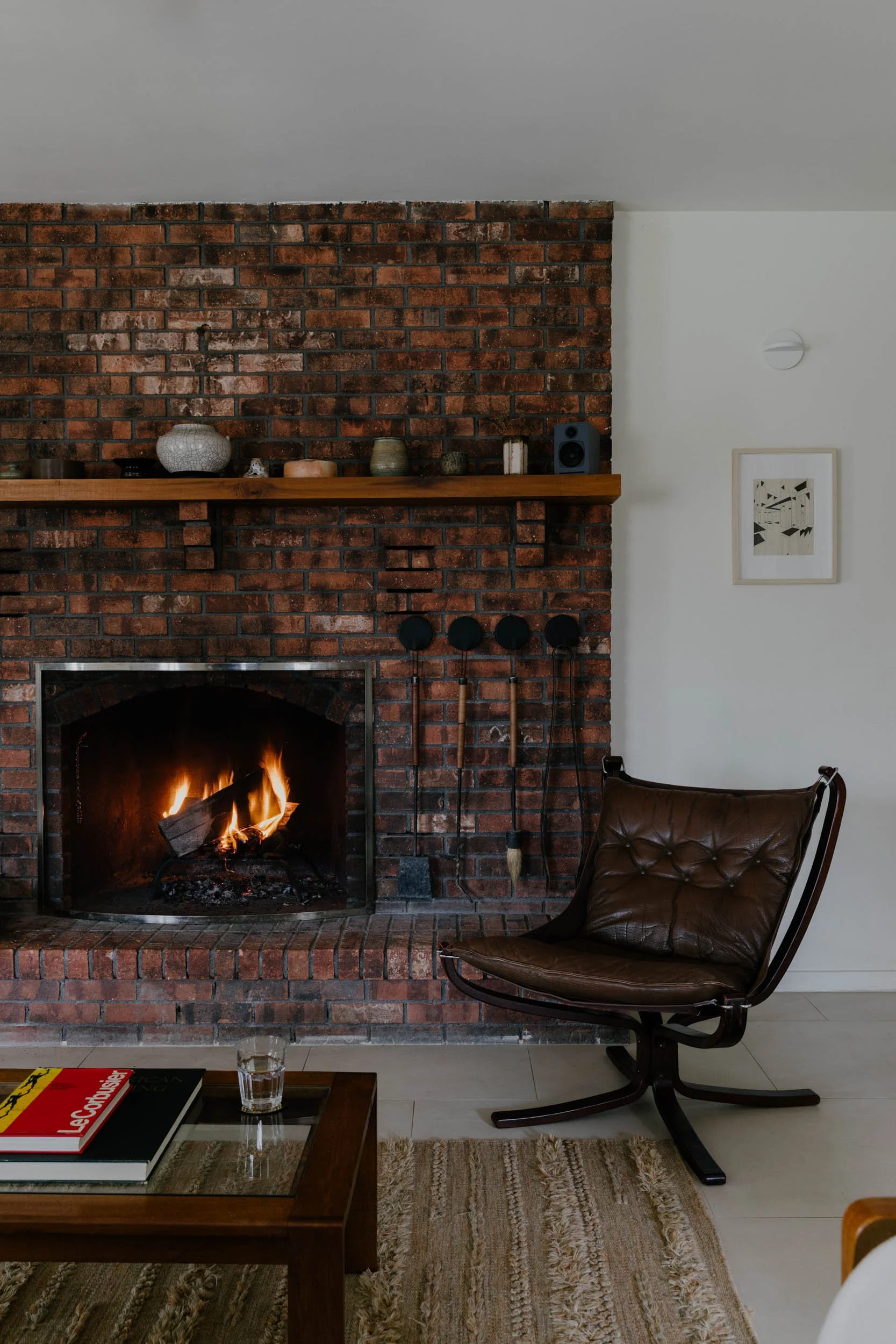 Just off the kitchen, a vintage Knoll sofa flanked by brown leather Falcon chairs forms an intimate seating area oriented toward a brick fireplace—close enough to feel connected to the kitchen’s activity, yet cozy in its own right. At the opposite end of the house, separated by the home’s utility core a second lounge offers a more private retreat, anchored by a Milo Baughman sectional and a large television. Bridging these two zones, Studio 8 inserted a small white marble Tulip table in front of a 1960s bookshelf sourced from a West Village estate, styled as a game table complete with a wood-and-ivory chess set from an Ohio auction house. A midcentury piano sits just beyond, both pieces illuminated by low-hanging pendants that cast a soft, theatrical glow.