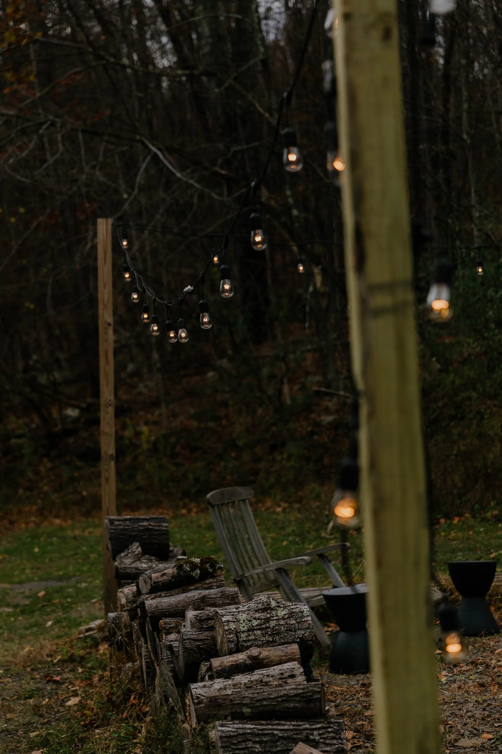 Outdoors, the architects extended the project’s ethos of reuse and conviviality. Off the dining room, a new glass door opens onto a patio that once housed a makeshift garage. Wood salvaged from the demolition was repurposed into low planter walls, now filled with wildflowers that bloom in rotation throughout the year. A large square dining table and teak lounge chairs set the stage for long, communal meals. Nearby, a former driveway has been transformed into a gravel gathering space anchored by a rusted steel fire pit fabricated by longtime collaborators Gunnar Design, with ash tree stumps serving as seats. String lights unify the outdoor rooms, lending them a festive, yet restrained, glow.